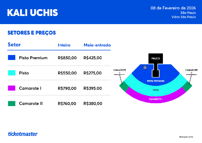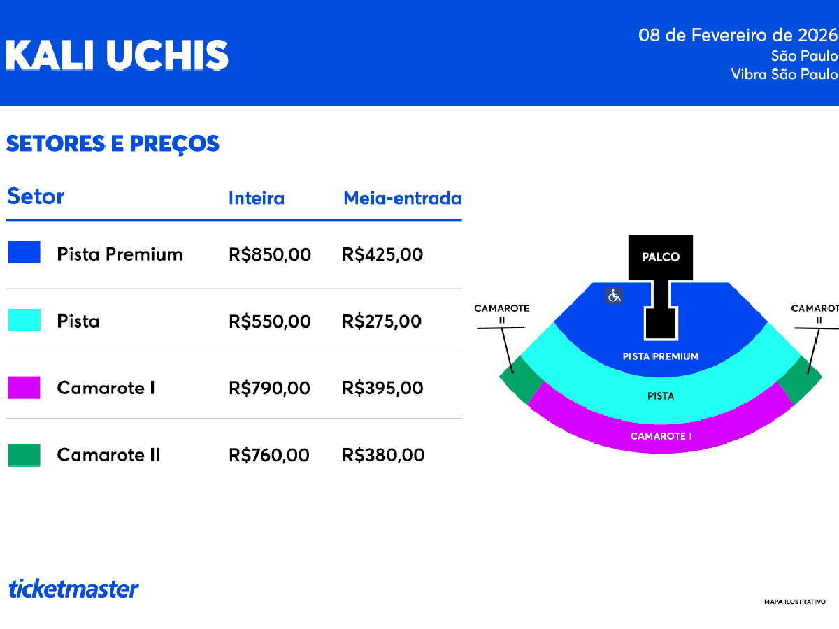 - Pista Premium - R$ 850,00 (inteira) | R$ 425,00 (meia-entrada)