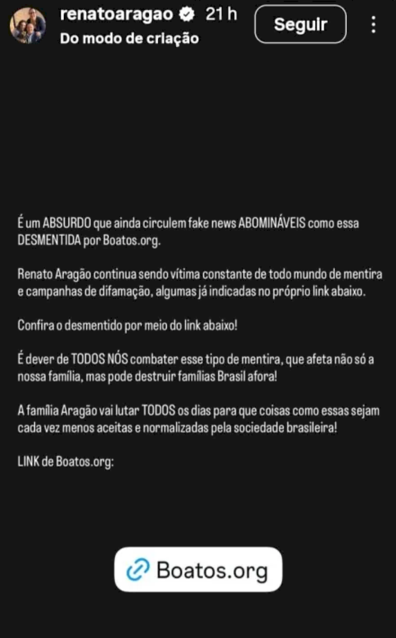 "Renato Aragão continua sendo vítima constante de todo tipo de mentira e campanhas de difamação. É dever de todos nós combater esse tipo de mentira, que afeta não só a nossa família, mas pode destruir famílias Brasil afora. A família Aragão vai lutar todos os dias para que coisas como essas sejam cada vez menos aceitas e normalizadas pela sociedade brasileira", concluiu a equipe do humorista em seu stories do Instagram.