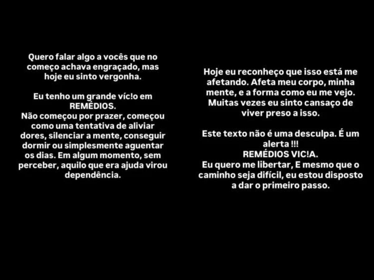 "Hoje reconheço que isso está me afetando. Afeta meu corpo, minha mente e a forma como eu me vejo. Muitas vezes sinto um cansaço de viver preso a isso. Este texto não é uma desculpa. É um alerta. Remédios viciam. Quero me libertar e, mesmo que o caminho seja difícil, estou disposto a dar o primeiro passo", declarou.