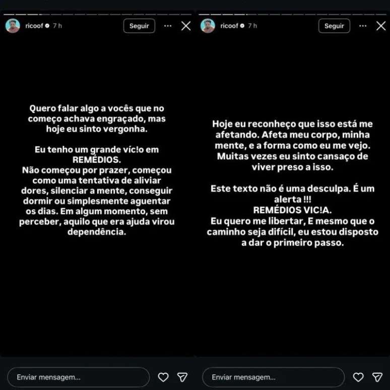 Em um texto sincero, Rico afirmou que sente vergonha da situação. Ele decidiu falar abertamente para que seu drama sirva de exemplo. O objetivo é alertar os fãs que o acompanham diariamente.