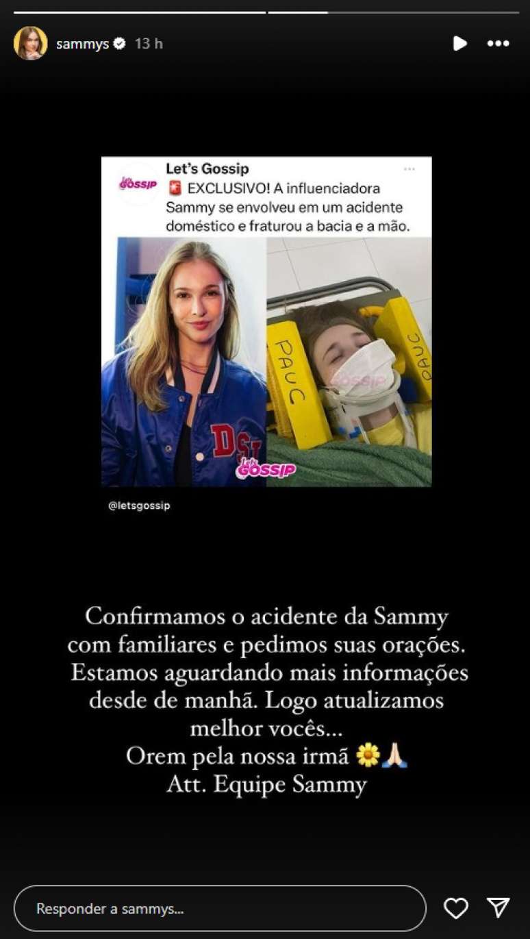 "Confirmamos o acidente da Sammy com familiares e pedimos suas orações. Estamos aguardando mais informações desde de manhã. Logo atualizamos melhor vocês. Orem pela nossa irmã Att. Equipe Sammy", diz o comunicado publicado no Instagram da famosa.