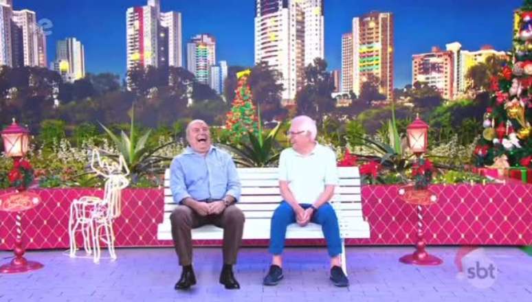 "Neste Natal, eu ganhei um presentão: dividir o banco da Praça com o seu criador, o meu pai, Manoel de Nóbrega. É um encontro de duas gerações, né, pai?”, disse Carlos Alberto de Nóbrega. “Três. Tem o Marcelo e o Beto”, respondeu a inteligência artificial, citando filhos de Carlos que trabalham no programa.