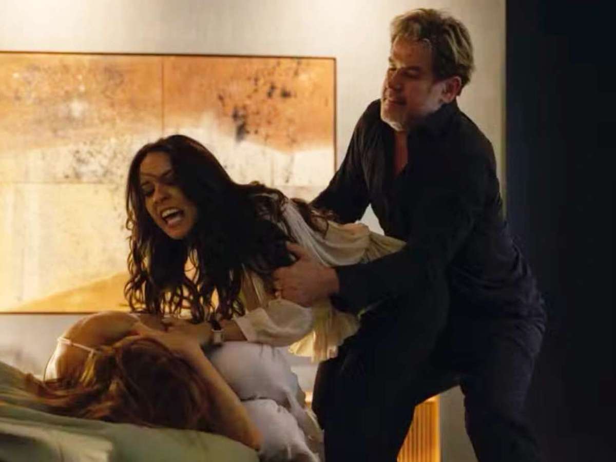 A sequência começa quando Zenilda chega de surpresa e flagra Ferette (Murilo Benício) na cama com a mulher que ela tratava como amiga de confiança. O choque dura poucos segundos. A indignação toma conta da advogada, que fecha o quarto e impede qualquer tentativa de fuga da rival.