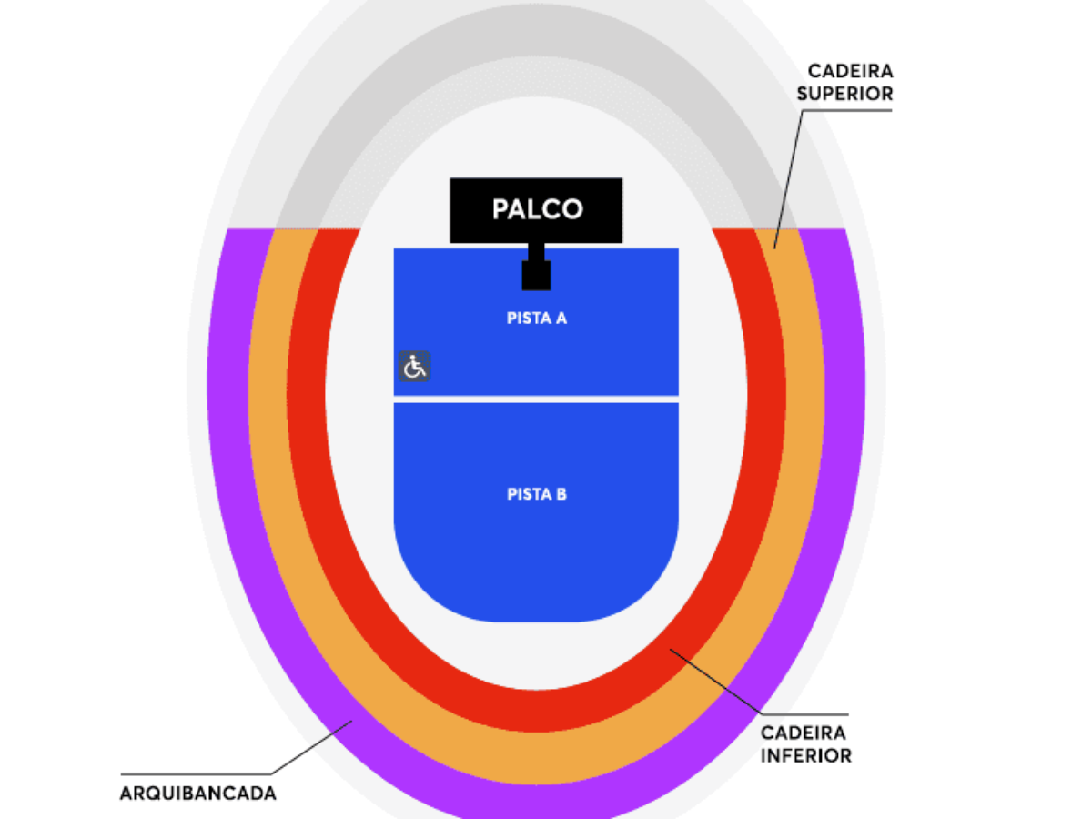 A pista é um setor único, dividido por razões de segurança em pista A e pista B. Não haverá fluxo de pessoas entre a pista A e a pista B, e os acessos serão diferentes.