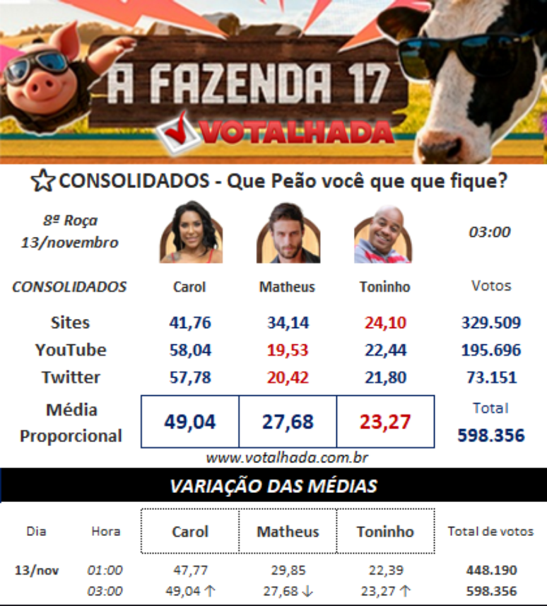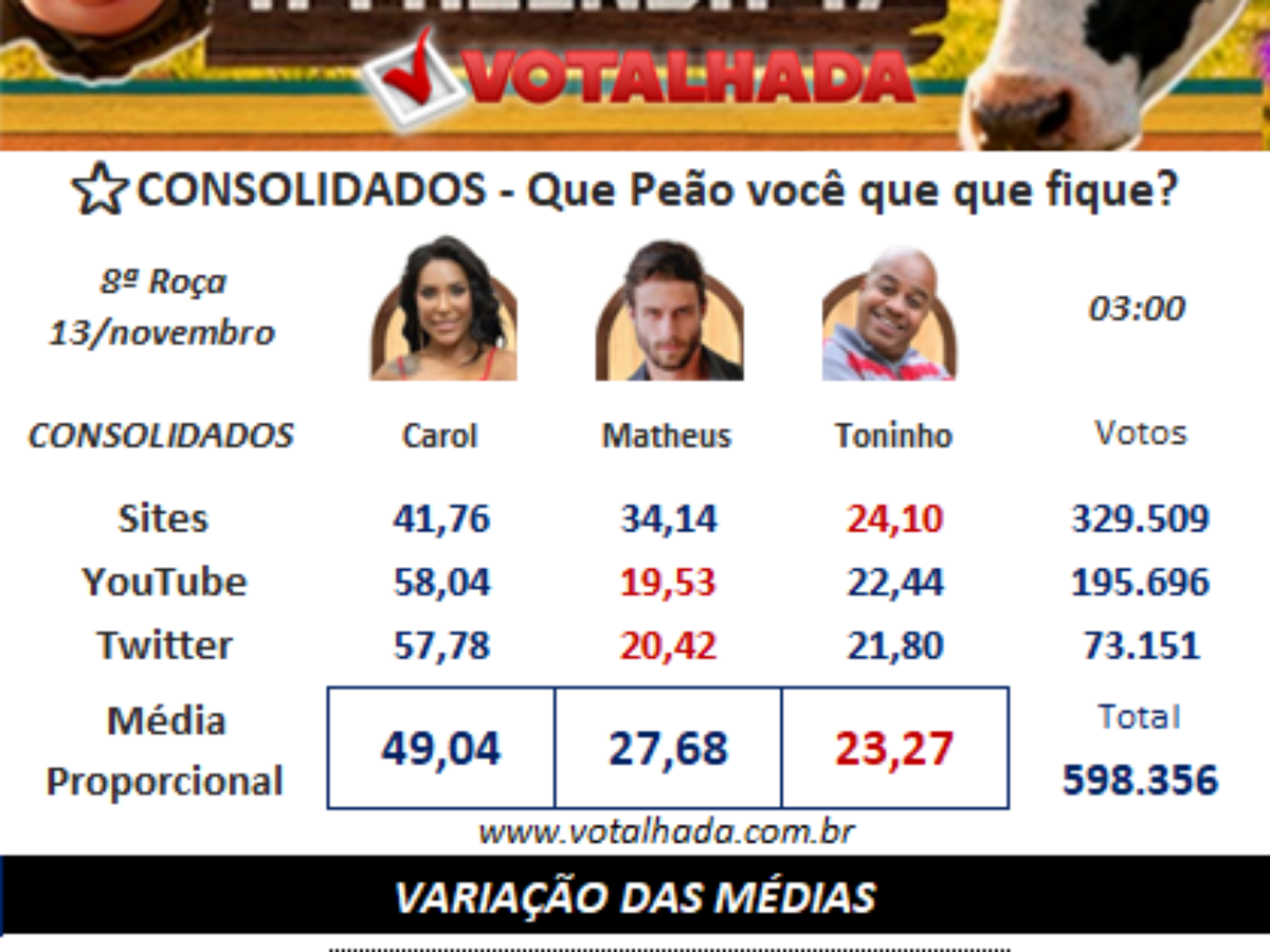 Segundo o Votalhada, um site que reúne as principais enquetes da internet, Toninho corre mais risco de ser eliminado, na primeira parcial ele aparece com apenas 23,27% dos votos para ficar. Matheus está perto com 27,68%. Já Carol está confortável nesta votação com 49,04$ da preferência do público.