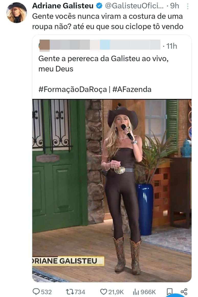 A formação da quarta Roça de A Fazenda 17, na noite de terça-feira (14/10), ganhou repercussão nas redes sociais, mas não pelas tradicionais discussões entre os peões. O que chamou atenção do público foi o look escolhido por Adriane Galisteu, que apresentava uma costura no meio das pernas, deixando a região íntima da apresentadora em evidência. O detalhe gerou comentários bem-humorados e memes entre os internautas, especialmente no X, antigo Twitter.