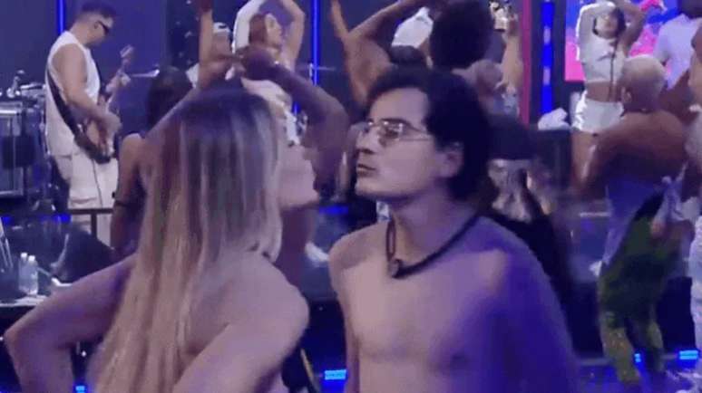 Logo em seguida, o artista disse que queria "fazer um bebê" com a loira, que reagiu com bom humor: "Vamos, vamos sim!". "Vamos fazer um menino atrás do outro, pode arrancar esses trem, roupas, joga tudo, vamos agora!", reforçou Dudu em tom de brincadeira.