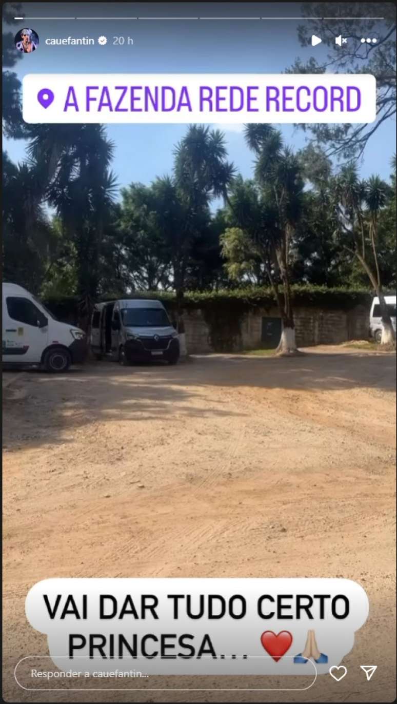 Nas redes sociais, Cauê mostrou a fachada do reality rural e escreveu uma mensagem de apoio. A cena teve forte repercussão por conta da temporada anterior, quando as irmãs de Deolane Bezerra invadiram o programa para exigir a saída emergencial da advogada. "Vai dar tudo certo, princesa", declarou o rapaz.