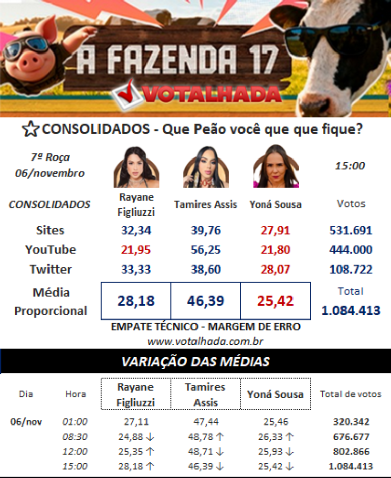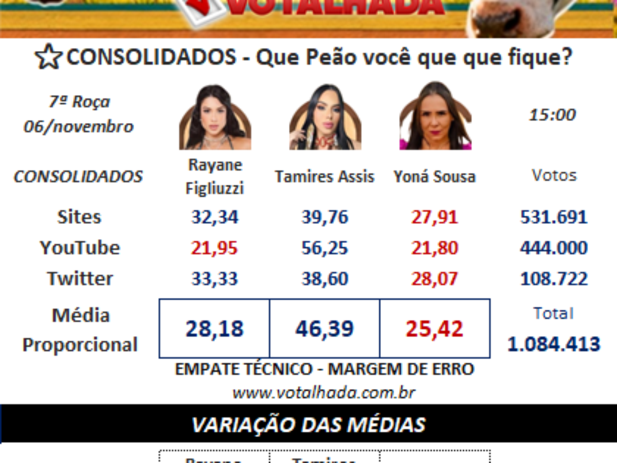 Agora no site Votalhada, que reúne as principais enquetes da internet, com mais de 1 milhão de votos somados na última atualização, Yoná deve deixar o confinamento, pois tem apenas 25,42% dos votos para ficar. Rayane tem 28,18% e Tamires 36,39%.