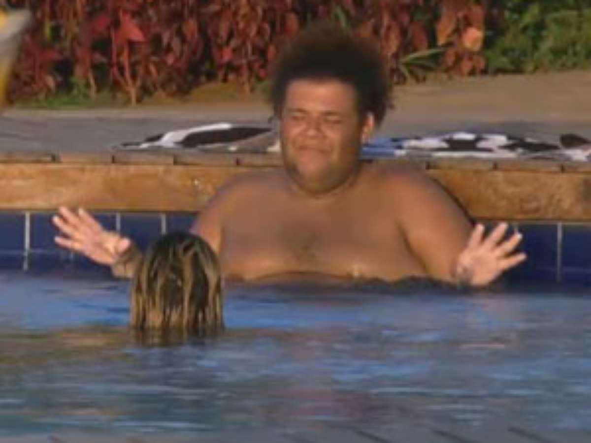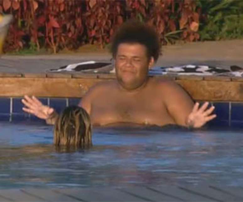 Paulo Nunes e Yani de Simone tomaram banho juntos nesta quinta-feira (4). O ex-jogador reclamou da água gelada. Os peões ainda estão sem água quente, devido a uma punição pelo mau uso dos microfonesFoto: TV Record / Reprodução