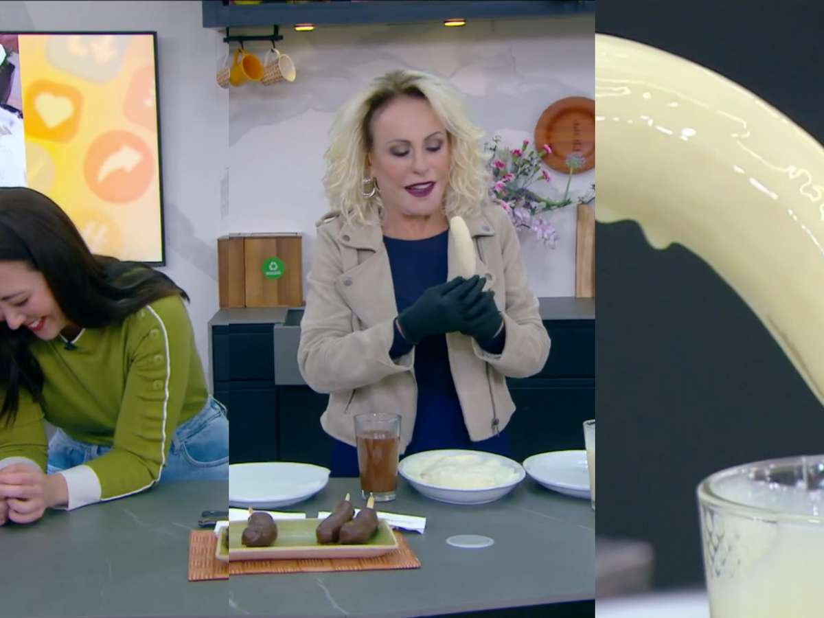 "Eu ia falar que eu gosto mais da nanica, mas já vou...", desconversou a jornalista. "Gosta mais dessa, Ju?", provocou a ave. "Eu prefiro a nanica, é mais doce", respondeu a mulher. "É simplesmente pegar a banana, colocar o palito do sorvete, cuidado para não ultrapassar aqui e furar lá na frente. Não pode ultrapassar a banana. É só até onde dá. Aí você vem, bota a lata de leite condensado dentro do copo", seguiu a apresentadora.