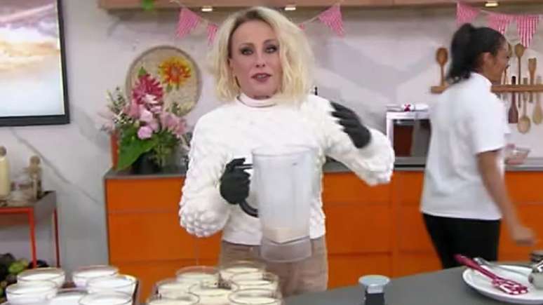 Ana Maria ainda inventou de colocar um pouco de paçoca na receita. "Essa é a receita do chef, mas a minha leva paçoca. Eu sou uma paçoqueira daquelas, pode até separar um pouco de amendoim torradinho para enfeitar", disse. E, em seguida, quis provar a misturinha: "Vocês vão amar isso que eu acabei de inventar. Alguém me dá um copinho para tomar isso daqui".