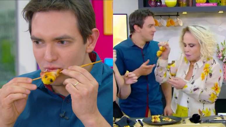 "Vem cá, Jodar. Começa nesse aqui, air fryer", disse Ana Maria, oferecendo o alimento para o profissional. Ao perceber que o repórter não parava de se alimentar, a loira tirou o espetinho da mão dele. "Não é para comer tudo", disse a global, entregando outro espetinho para Alessandro.