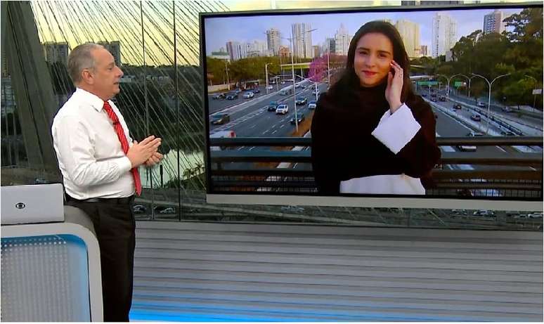Em seguida, a repórter iniciou sua cobertura: "Boa tarde pra você, pra vocês que nos assistem. Mais um monte de gente aqui pela rua tá reclamando do frio, que tá muito gelado, fora o vento que tá cortando bastante". Ela continuou explicando o cenário do trânsito: "A gente fala bem do ladinho do Parque Ibirapuera, e vou aproveitar pra mostrar pra vocês como é que tá o movimento aqui nessa região, mas digo antes o seguinte: a gente tá circulando desde o começo da tarde por São Paulo. No início da tarde, o trânsito estava sossegado, mas esse cenário já mudou completamente".