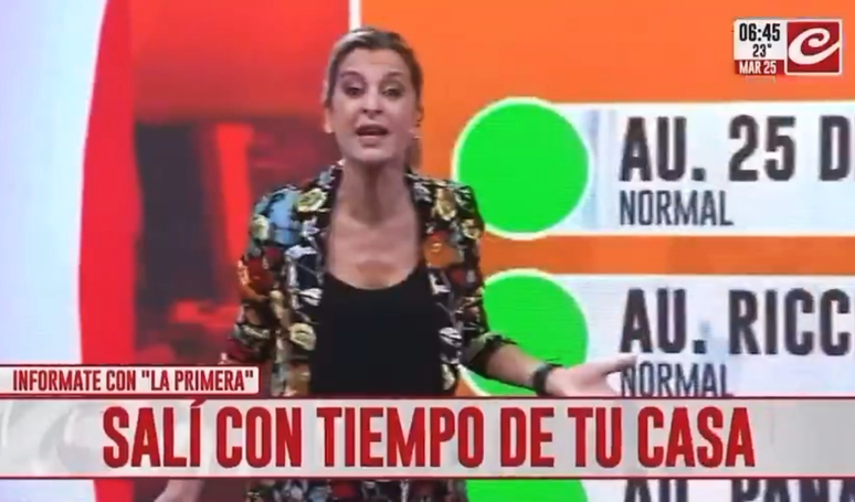 "Agora vamos falar sobre... Os acessos", suspirou ela, ao ver que a equipe transmitiu os dados do trânsito. "Eu havia dito a temperatura, mas vamos falar dos acessos", disparou Mariela. Na sequência, o apresentador Gustavo Chapur tentou acalmar a colega, mas não funcionou.