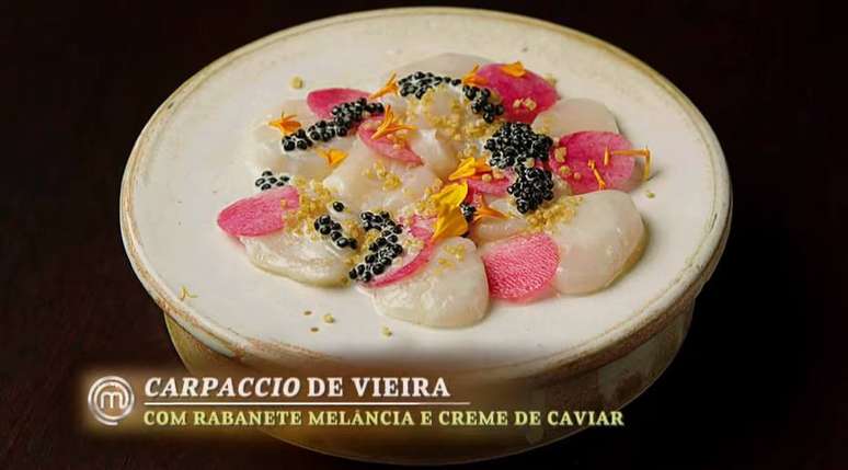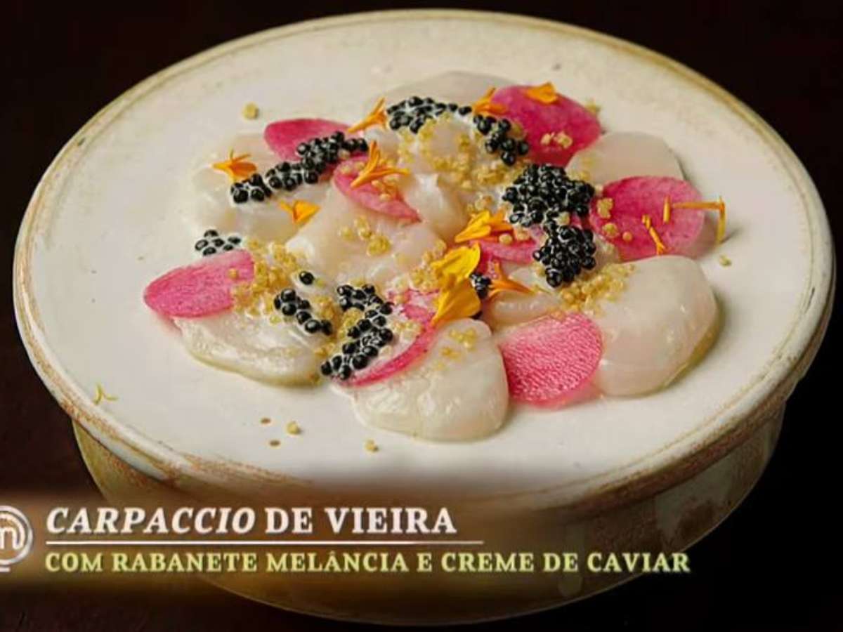 Na grande final do 'MasterChef Profissionais', Rafael apresentou uma entrada de carpaccio de vieira com rabanete melancia e creme de caviar.