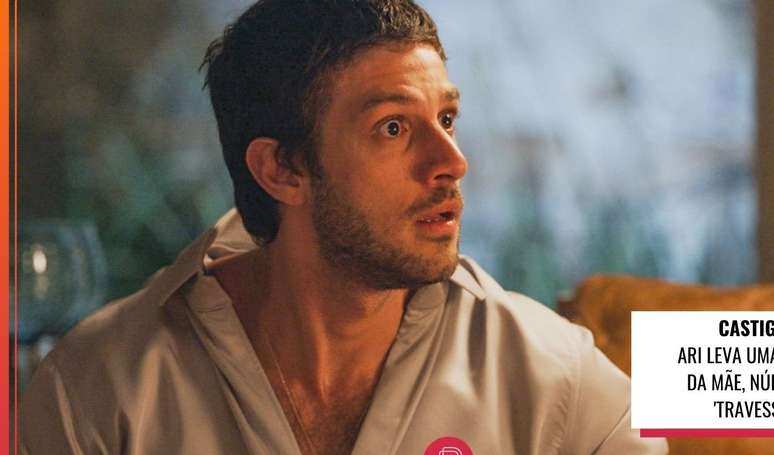 Ari (Chay Suede) vai levar uma surra da mãe, Núbia (Drica Moraes) na novela "Travessia" quando se esconder da polícia após fazer ameaças à ex Brisa (Lucy Alves). A comerciante tira o chinelo dos pés e avança na direção do filho golpista e ladrão. "O que foi que tu fizeste, abestado? Me deixando doida aqui dentro? Toma, toma!", diz, dando-lhe umas chineladas.