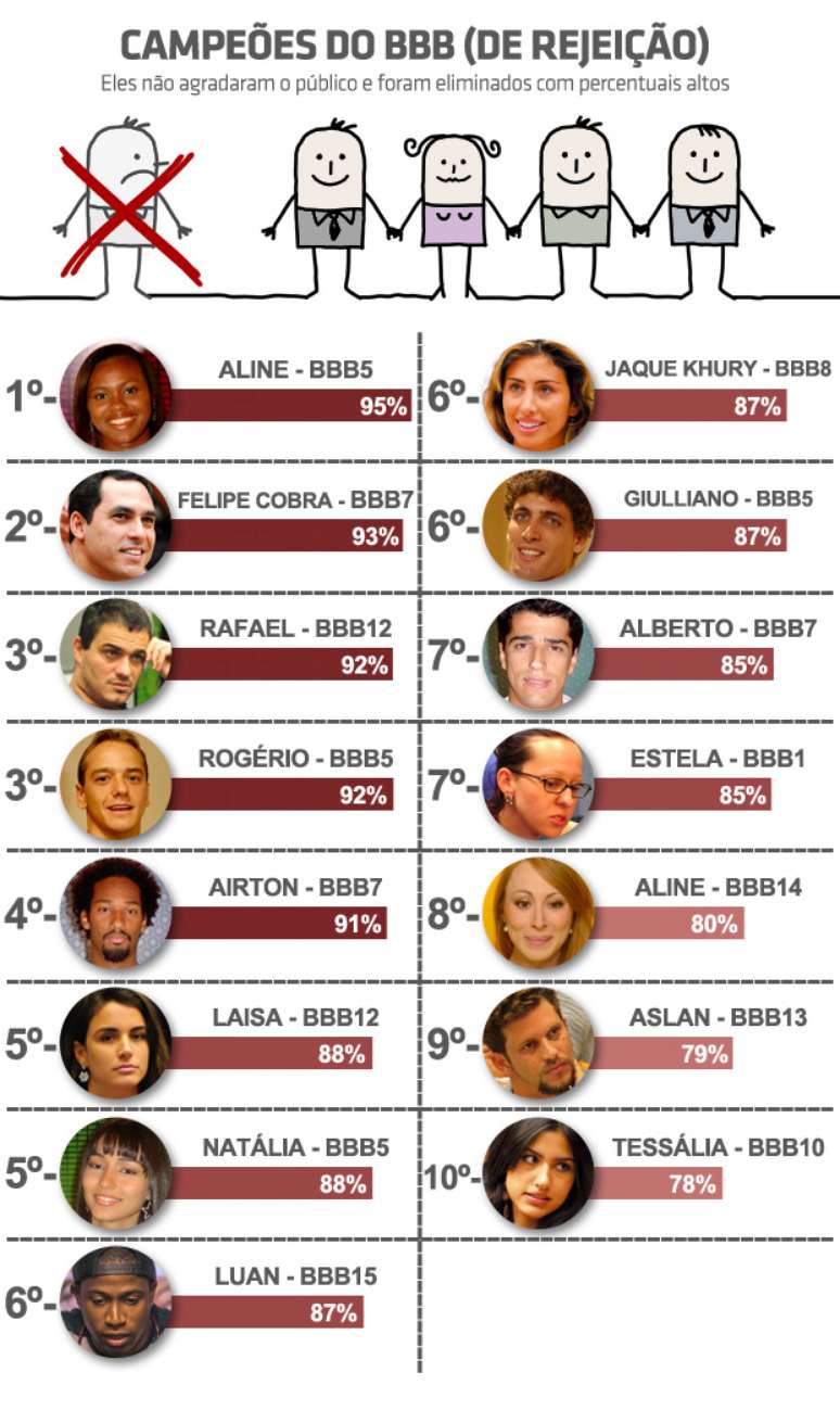 Além de Luan, que na 15ª edição do reality perdeu a chance de levar R$1,5 milhão para casa ao ser eliminado com 87% dos votos, lembre outros recordistas de rejeição.