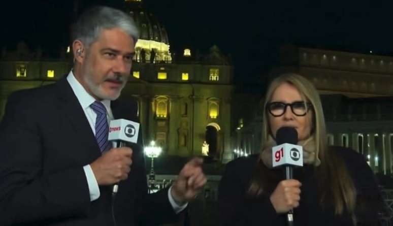 Ilze Scamparini acompanhou William Bonner em uma entrada ao vivo do Vaticano, mas parecia desconfortável ao lado do apresentador.