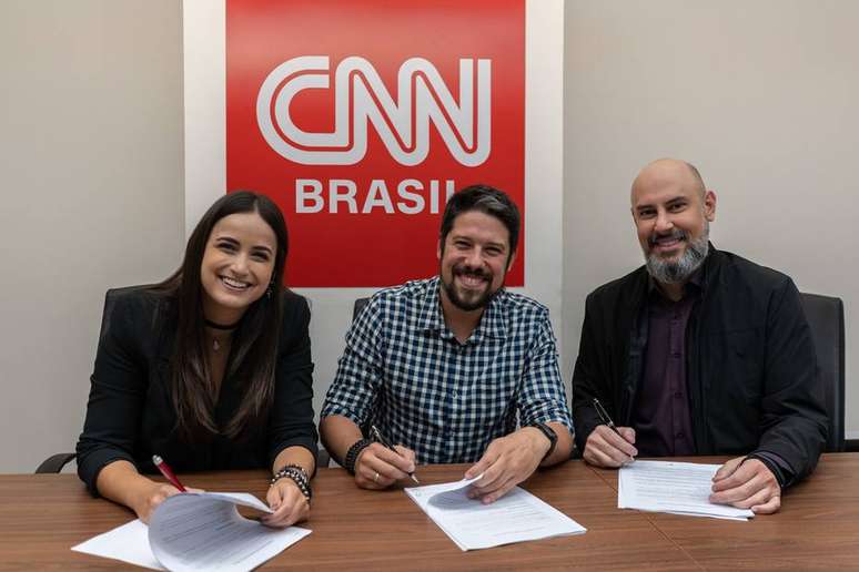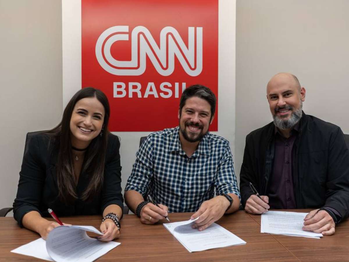 Phelipe Siani e Mari Palma assinam contrato com a CNN Brasil, em foto ao lado de Douglas Tavolaro, CEO do canal.