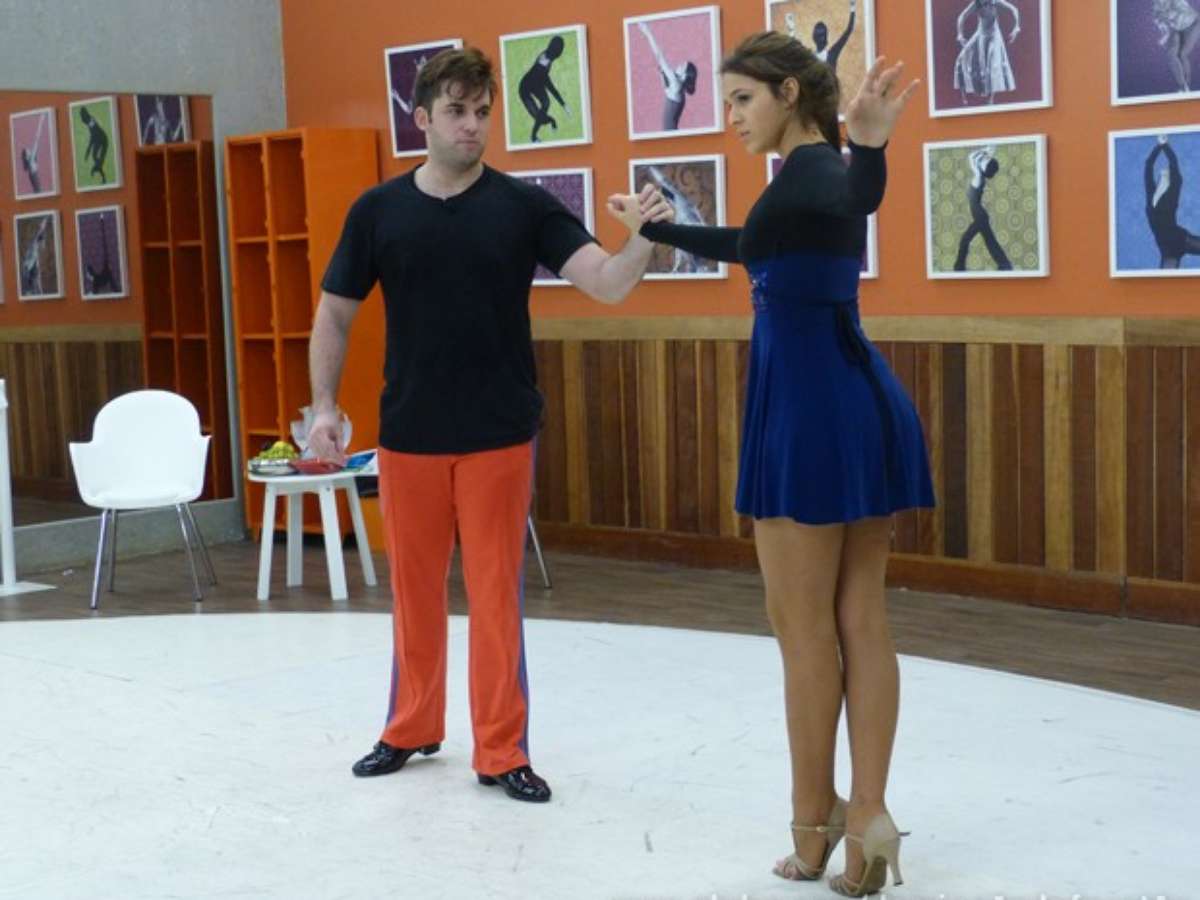 Carol Castro também achou a coreografia do samba mais difícil que o tango. Durante o ensaio ela exibiu a barriga sarada, usando um look de top e saia de franjinha. Depois de sambar muito, bem cansada ela brincou: “ambulância! Socorro!”.