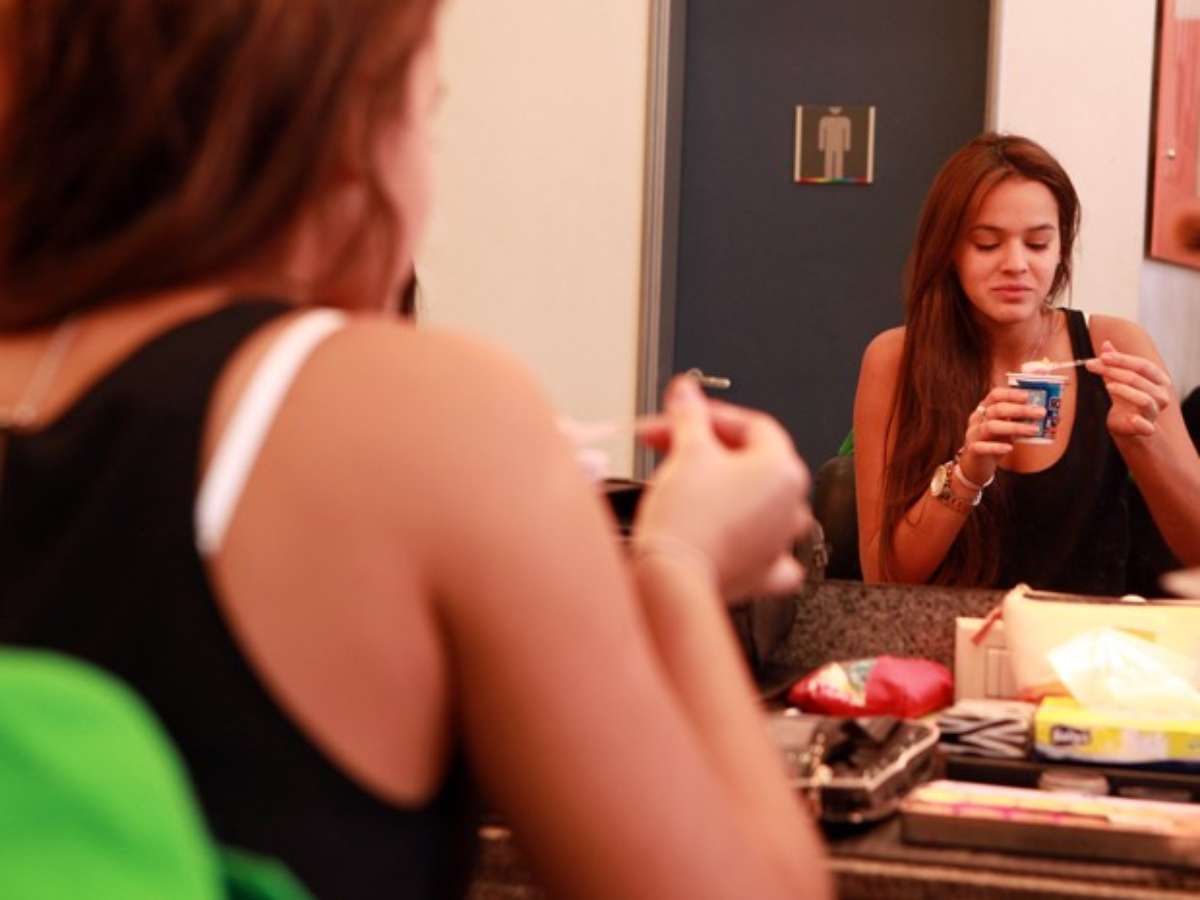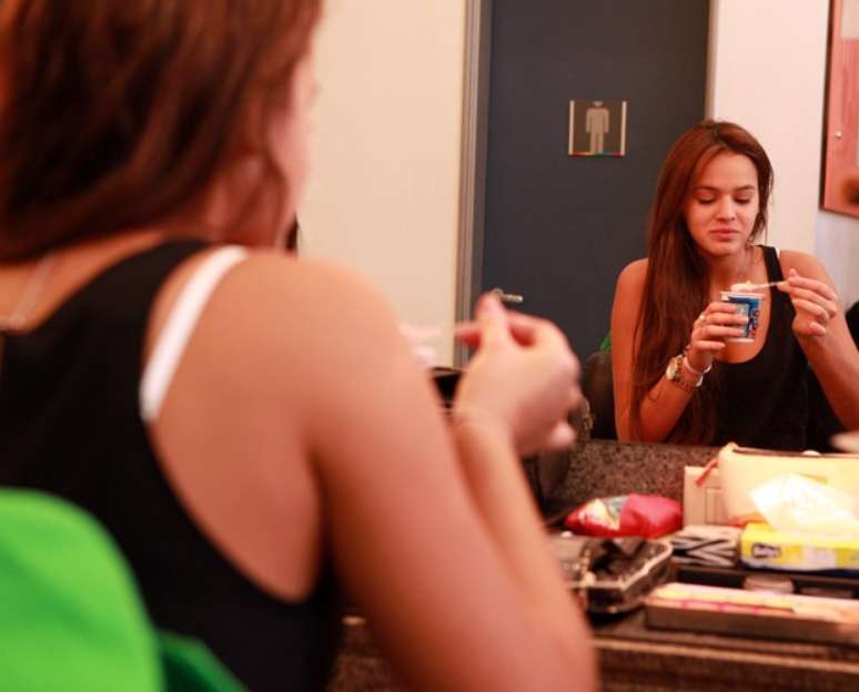 Antes de começar a se maquiar, Bruna aproveitou para fazer um lanchinho leve e saboreou um iogurte de frutas.
