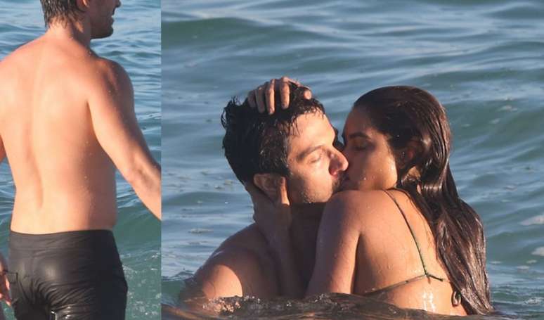 Já Romulo combinou camiseta com bermuda, sem dispensar os óculos escuros. Um pouco depois, os personagens mergulharam no mar, brincaram e trocaram beijos. Brisa, de biquíni, e Oto, com a mesma bermuda, mas sem blusa.