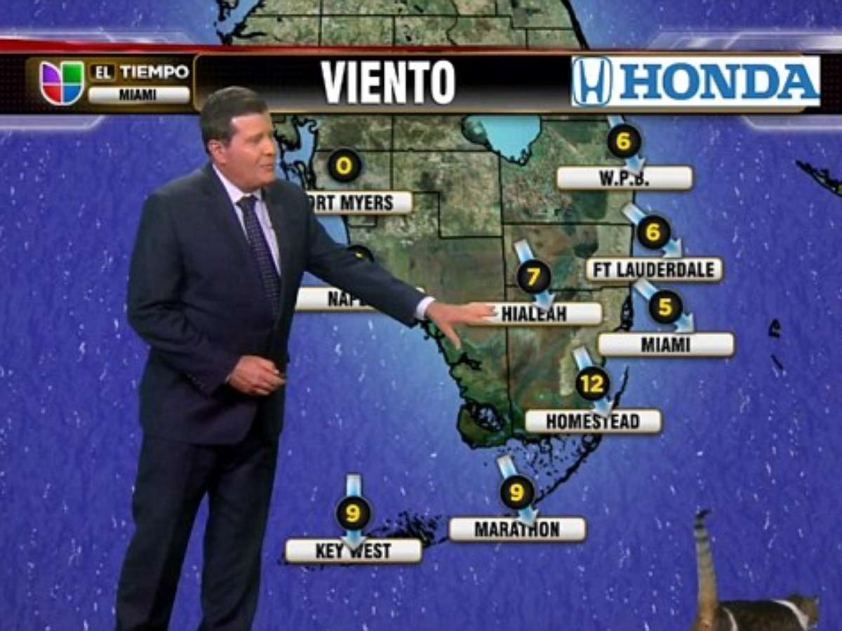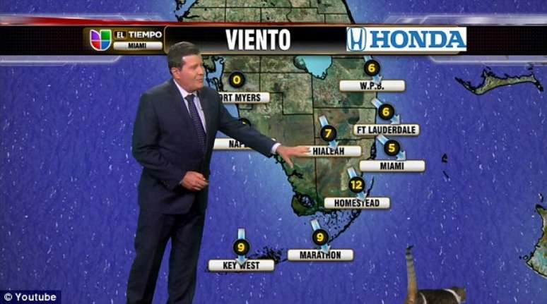 Um gato atrapalhou um boletim da previsão do tempo nos Estados Unidos. O felino entrou no estúdio e, alheio à transmissão, deu um passeio na frente do mapa no sul da Flórida. As informações são do Daily Mail.
