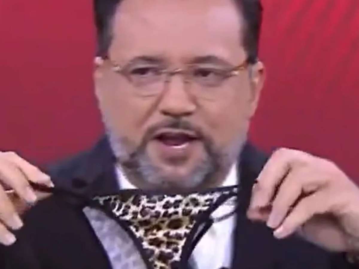 O famoso quebrou o protocolo do clássico jornalístico e mostrou uma calcinha ao vivo no SBT. Dani Brandi e Marco Pagetti se surpreenderam com o colega de trabalho.