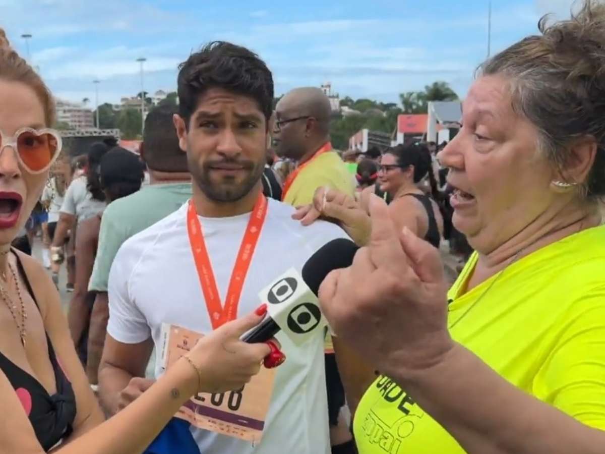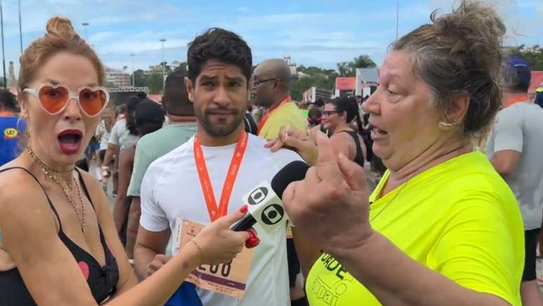 "Será?", desconversou o homem. "Minha filha passou ali, podia apresentar pra ele aí", disse uma mulher, surgindo durante a conversa. "Cadê sua filha?", questionou a jornalista. "Vou lá buscar ela. Correu, fez 10km, já tá cansada. Vou lá pegar", detalhou a senhora.