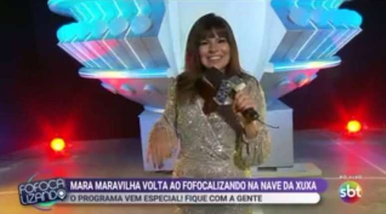 A apresentadora Mara Maravilha retornou ao programa Fofocalizando, do SBT, no programa desta quinta-feira, 25. Ela retornou à atração saindo de uma 'nave da Xuxa', colocada em um local próximo ao estúdio.