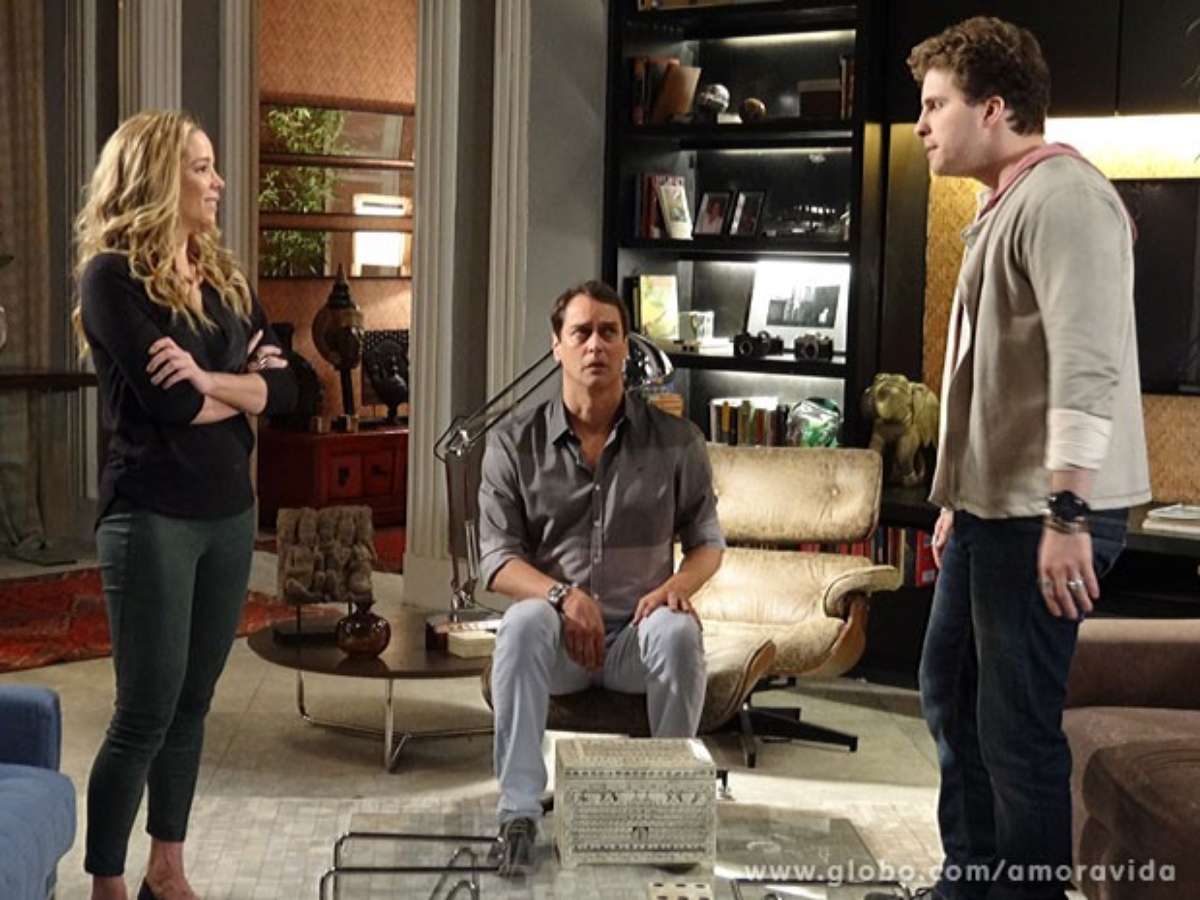 Félix (Mateus Solano) pedirá a César (Antonio Fagundes) que o ajude a conversar com Jonathan (Thalles Cabral) sobre sexo e entregará um pacote de preservativos ao filhoFoto: TV Globo / Divulgação