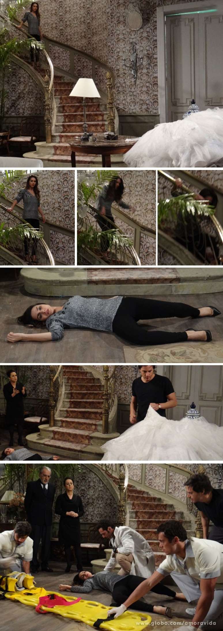 Leila (Fernanda Machado) levará um tremendo susto no capítulo desta sexta-feira (13) da novela global Amor à Vida. Se achando a dona da casa de Nicole (Marina Ruy Barbosa), ela desce as escadas da mansão gritando por Lídia (Angela Rebello), mas perde a pose ao avistar um vestido de noiva idêntico ao usado pela ruiva no dia de sua morte. Assustada, a jovem cai escada abaixo.