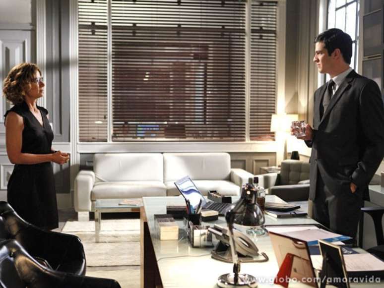 Félix (Mateus Solano) suspeitará que Aline (Vanessa Giácomo) é a amante de César (Antonio Fagundes) e fará muitas perguntas à secretária do paiFoto: TV Globo / Divulgação