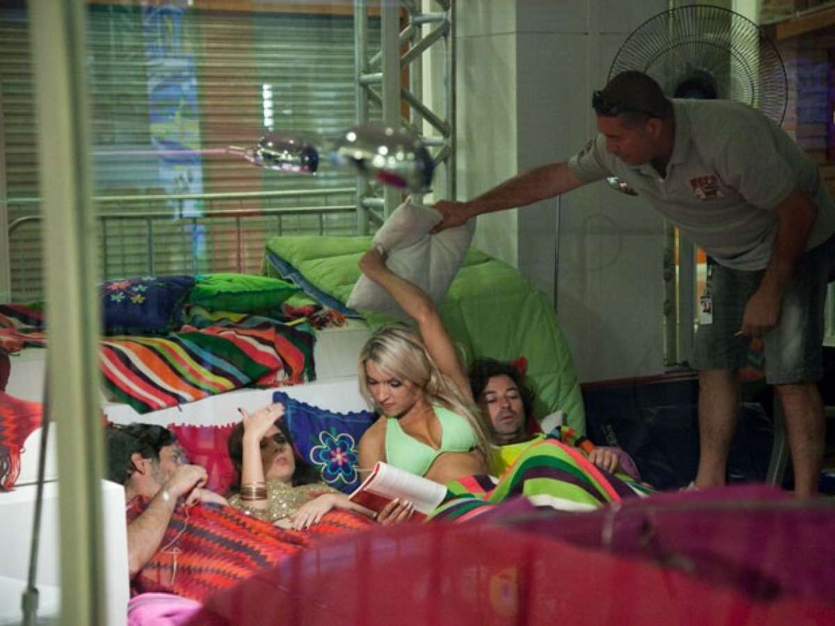 O esforço de Valdirene (Tatá Werneck) para entrar no Big Brother Brasil está valendo a pena. Nesta segunda-feira (23), foram gravadas cenas da piradinha na Casa de Vidro, montada em um shopping na zona oeste do Rio de Janeiro. Na cena, ela divide a cama com os concorrentes, Murilo (Emilio Orciollo Netto), Jefferson (Celso Bernini) e Ellen (Dani Vieira). Além disso, Ellen também apareceu se insinuando para Murilo e fez um strip tease ao lado de Valdirene para disputar a atenção dos marmanjos
