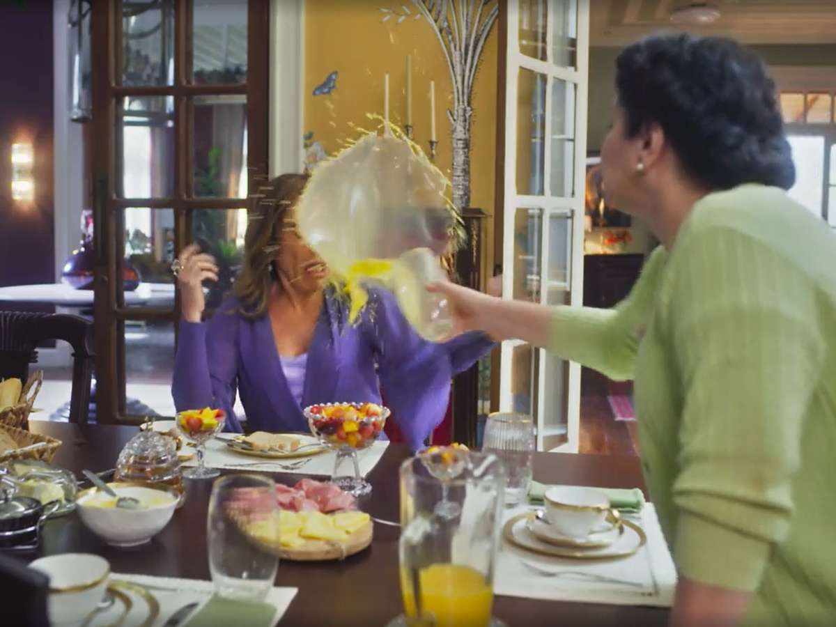 Às vezes, na edição, são usados efeitos especiais para valorizar a ação. Talvez tenha sido o caso do suco com trajetória anormal na mesa do café da manhã dos La Selva.