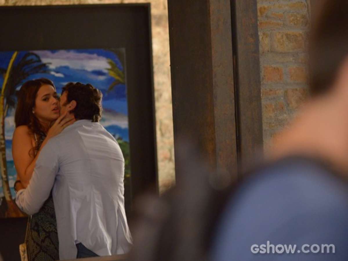 Nesse momento, André (Bruno Gissoni) entra no Galpão e vê o beijo apaixonado dos dois. Ele fica muito incomodado e cruza o olhar com a estudante. Luiza se afasta de Laerte. "Não acho certo a gente ficar nessa agarração aqui", explica. Mas o músico corta a explicação da amada e dá outro beijo nela. André não aguenta e vai embora. A cena vai ao ar nesta quarta-feira (7).