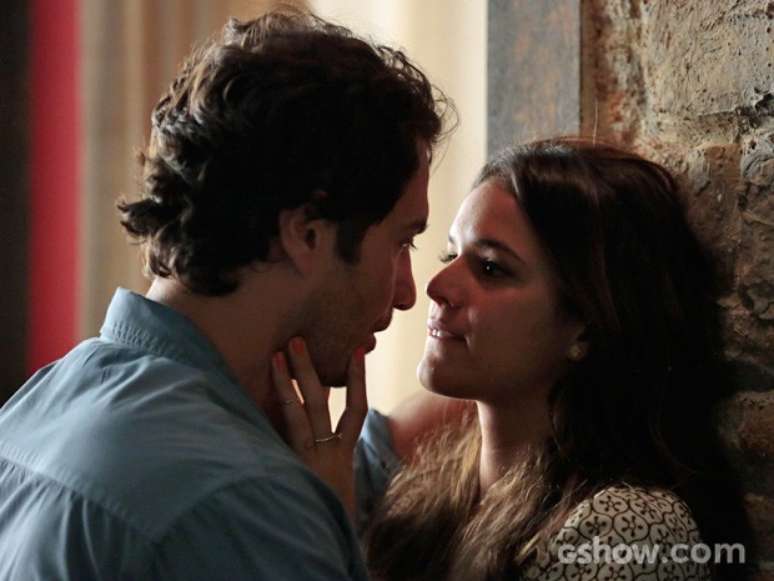 Luiza (Bruna Marquezine) faz uma surpresa para André (Bruno Gissoni) em casa e vê o namorado só de toalhaFoto: TV Globo / Divulgação