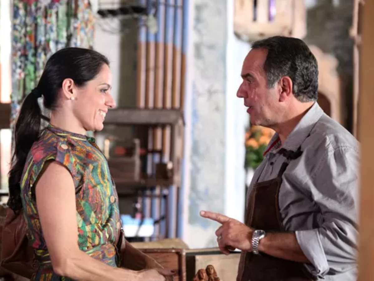 Ele lixa uma escultura quando é surpreendido pela amiga. Muito feliz com a novidade, ele logo a abraça e pergunta o motivo dela não ter avisado que iria à cidade. A moça conta que decidiu fazer uma surpresa.