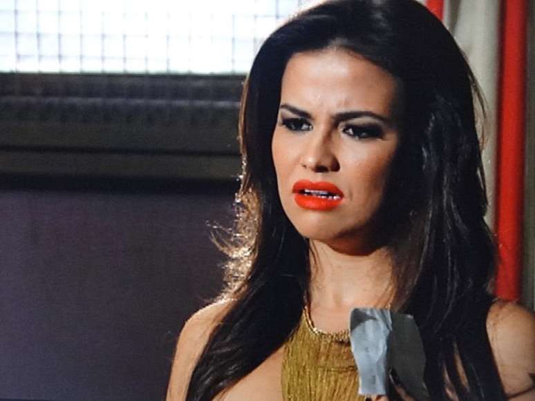 Érica (Flávia Alessandra) assiste ao DVD que Lívia (Claudia Raia) enviou com cenas quentes dela com Théo (Rodrigo Lombardi) e decide levar o material para o Coronel Nunes (Oscar Magrini)Foto: TV Globo / Divulgação