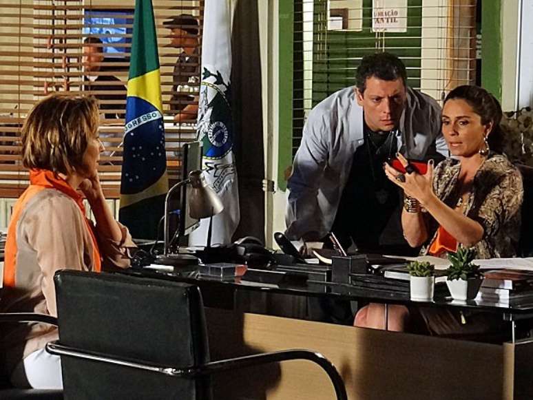 Lívia (Claudia Raia) se faz de desentendida e finge não conhecer Russo (Adriano Garib) quando Helô (Giovanna Antonelli) mostra fotos do capangaFoto: TV Globo / Divulgação