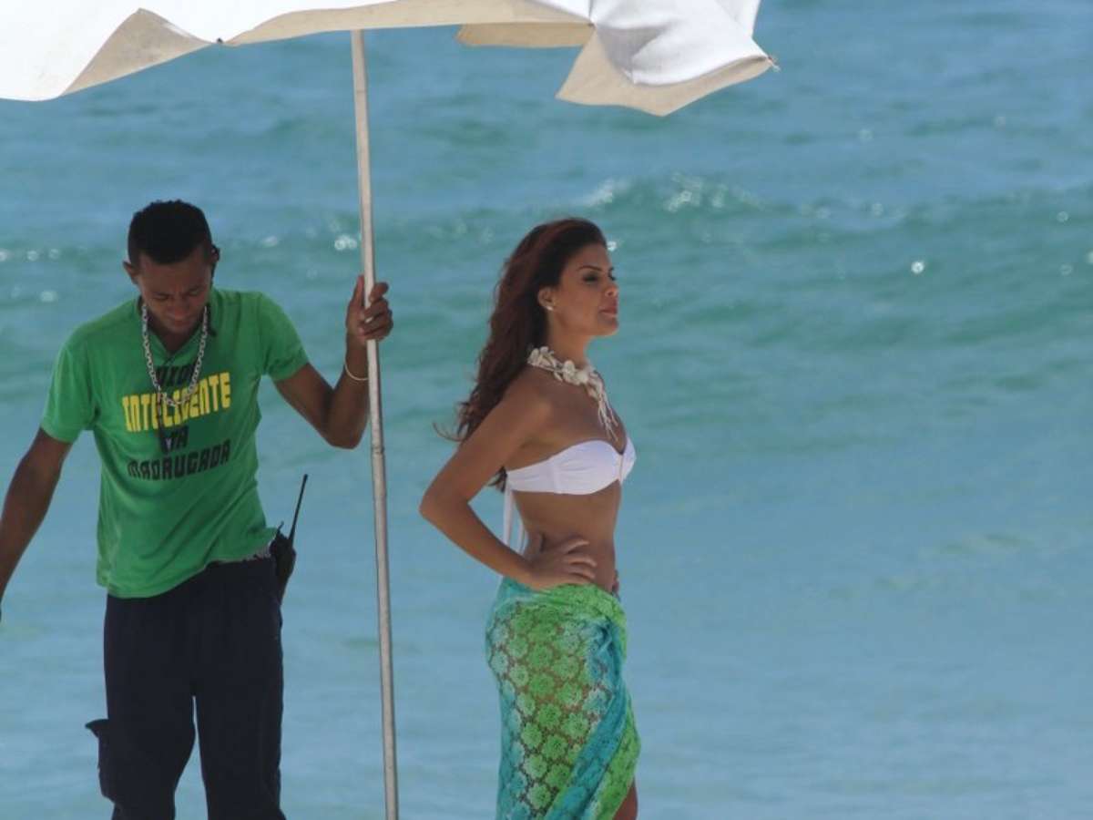 Lívia (Claudia Raia) aproveita o encontro com Théo (Rodrigo Lombardi) na praia para questionar o valor do depósito que o capitão fez para ela como indenizaçãoFoto: TV Globo / Divulgação
