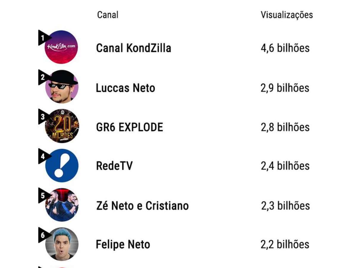 Entre os canais mais assistidos, encontram-se diversos relacionados ao mundo musical, como Kondzilla (1º) e GR6 Explode (3º) (funk) e o de Marília Mendonça (10º) e Zé Neto e Cristiano (5º) (sertanejo).
