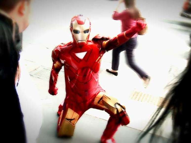 Apresentador do polêmico 'Teste de Fidelidade', João Kléber encarnou o super-herói Homem de Ferro em plena Avenida Paulista para quadro que será exibido no 'TV Fama' desta sexta-feira (24); objetivo foi ver se pedestres e passageiros de ônibus o reconheceriam no traje