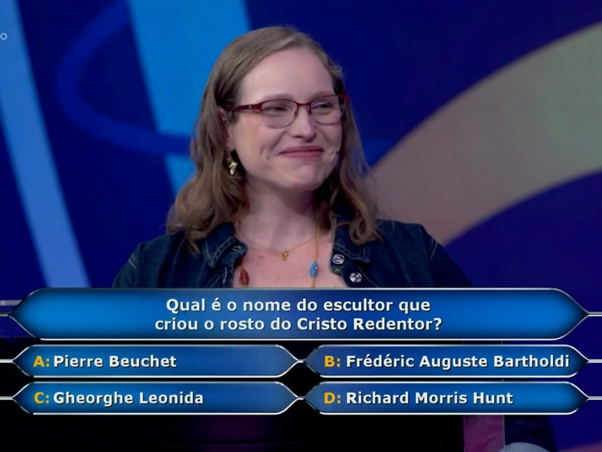 "Qual é o nome do escultor que criou o rosto do Cristo Redentor?", era a pergunta que Carolina deveria responder para garantir R$ 1 milhão. Ela não sabia a resposta e decidiu voltar para casa com os R$ 500 mil que já havia conquistado.