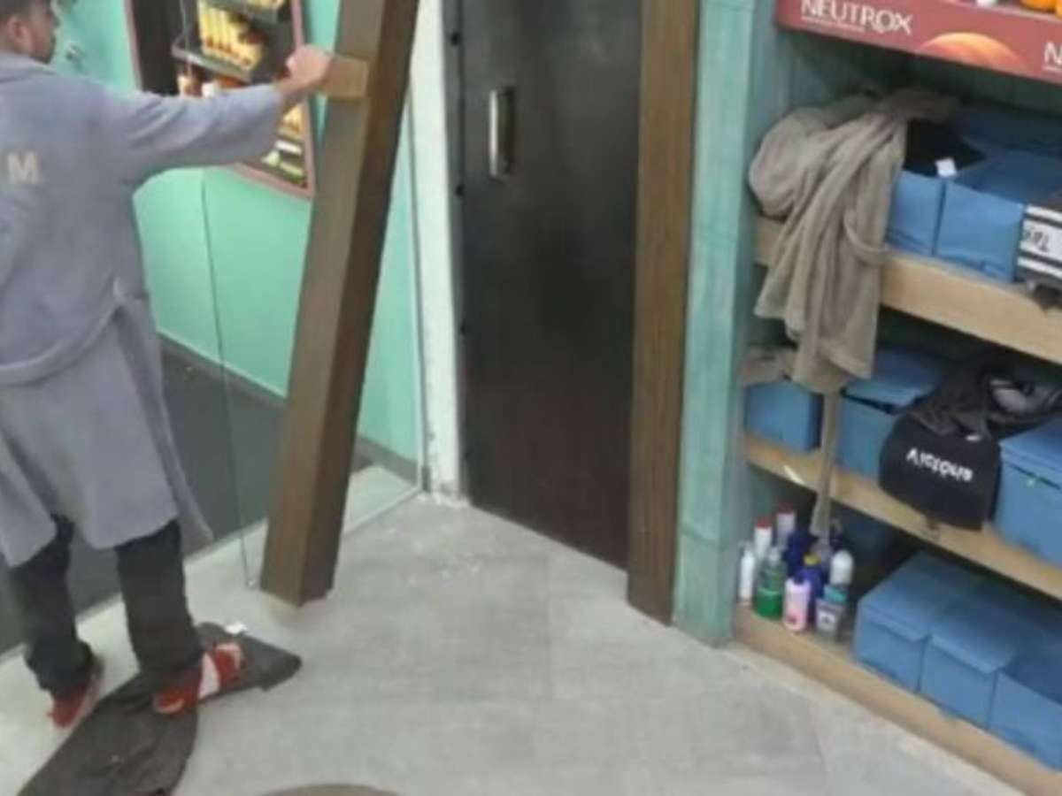 Ela se dirige ao banheiro da casa, entra no cômodo e começa a bater com força na porta, pelo lado de dentro. Não é possível ver a participante neste momento, mas nota-se que ela quebra parte da estrutura da porta.