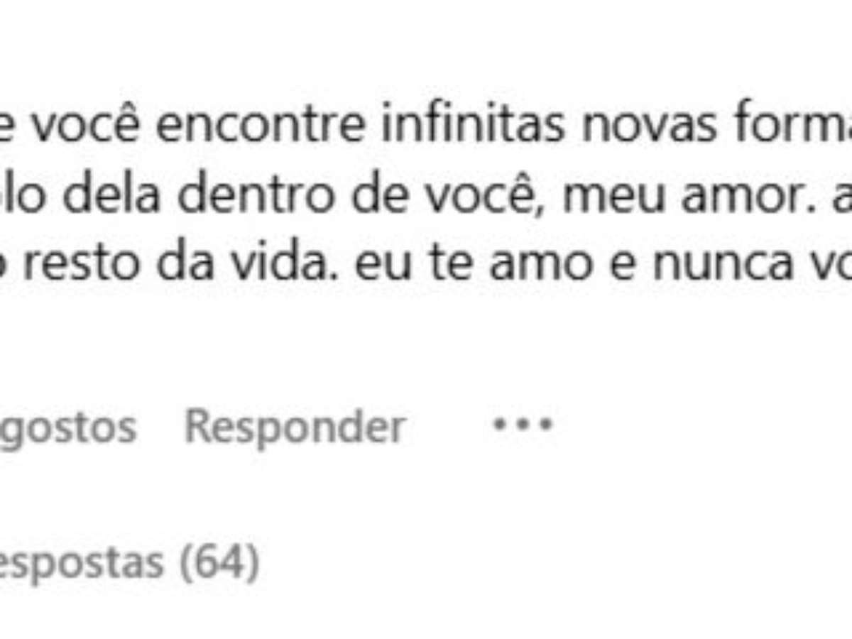 "Que você encontre infinitas novas formas de sentir o amor e o colo dela dentro de você, meu amor", escreveu. "A luz dela vai te iluminar para o resto da vida. Eu te amo e nunca vou largar sua mão", completou.