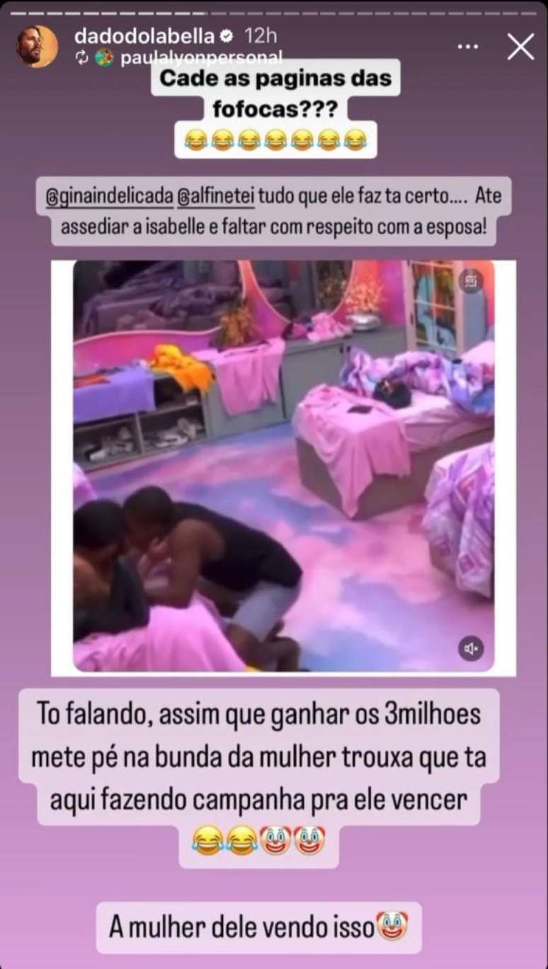 Em seguida, ele detonou a esposa do brother e alertou: "Tudo que ele faz está certo.... Até assediar a Isabelle e faltar com respeito com a esposa!. Tô falando, assim que ganhar os 3 milhões, mete o pé na bunda da mulher trouxa que tá aqui fazendo campanha pra ele vencer", escreveu. Por fim, ele colocou um emoji de palhaço e apontou: "A mulher dele vendo isso".