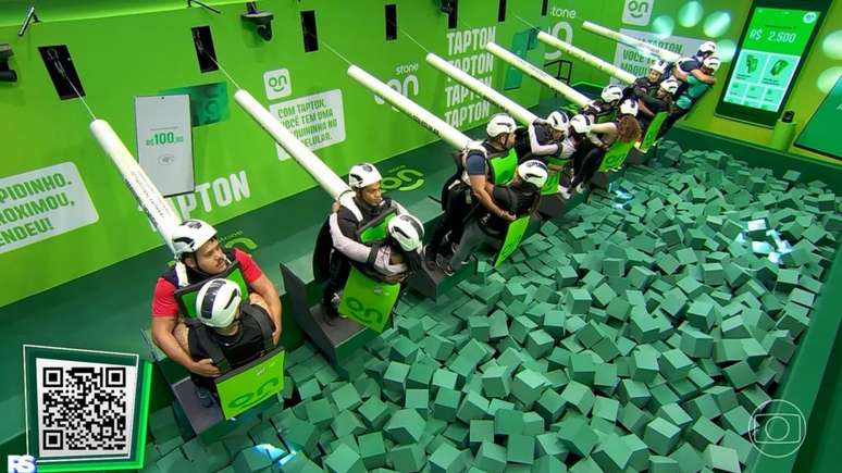 - Na primeira etapa, um dos participantes da dupla deveria procurar cards indicados em uma piscina de bolinha e repassá-los ao parceiro de jogo