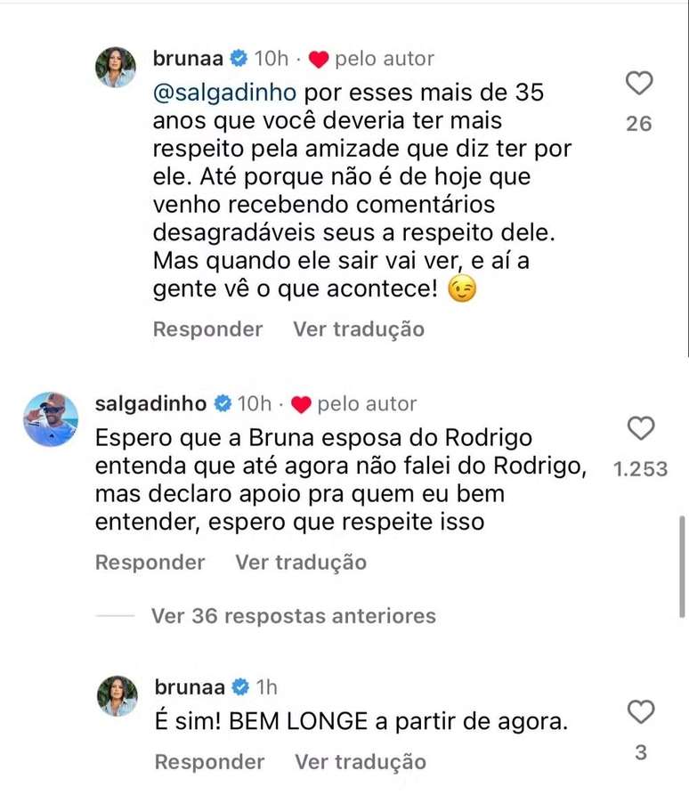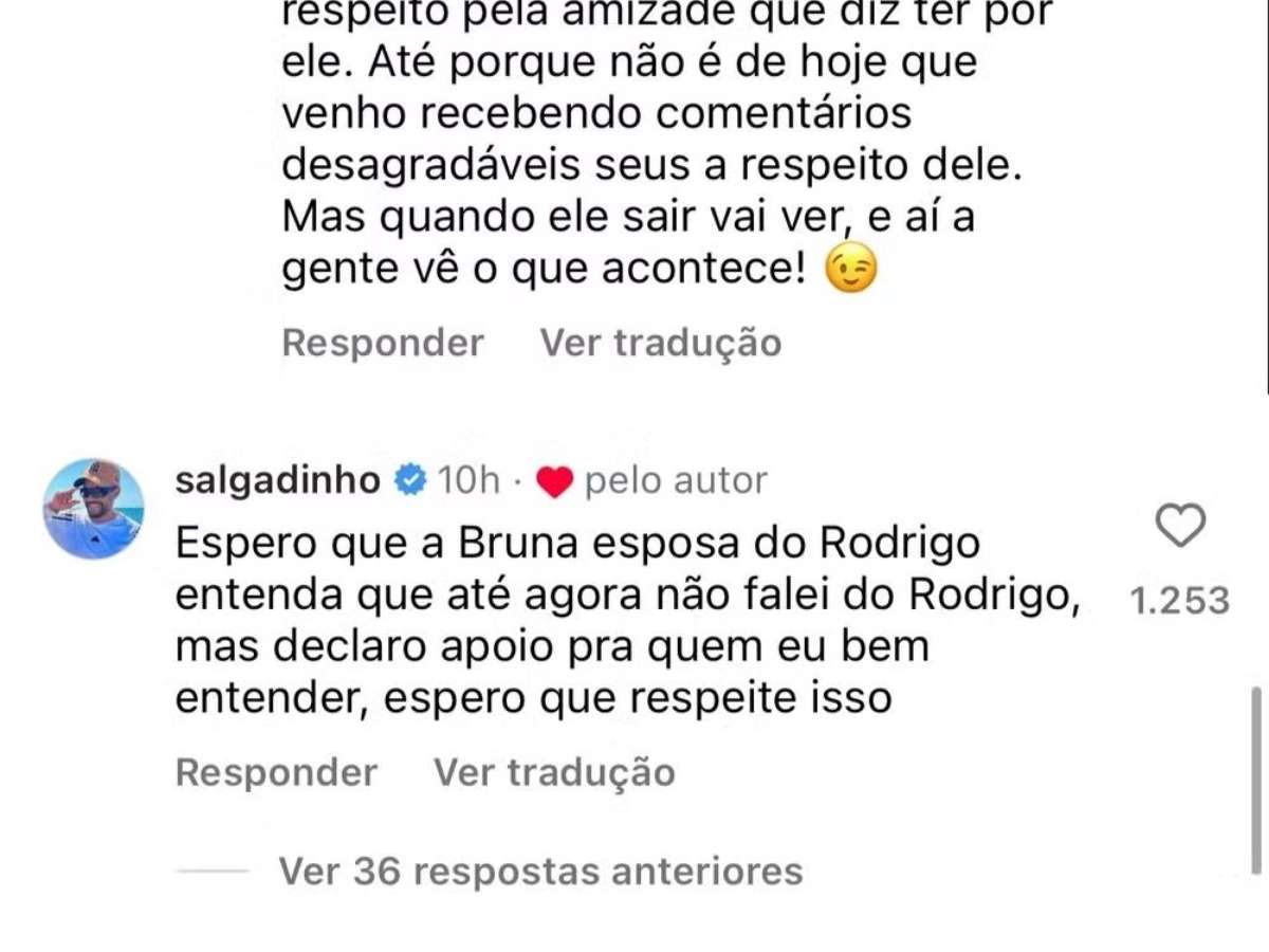 O ex-BBB deixou de seguir o amigo no Instagram. Isso porque em fevereiro, Bruna Amaral, mulher do ex-vocalista de Os travessos, não gostou de ler comentários negativos de Salgadinho sobre o marido.